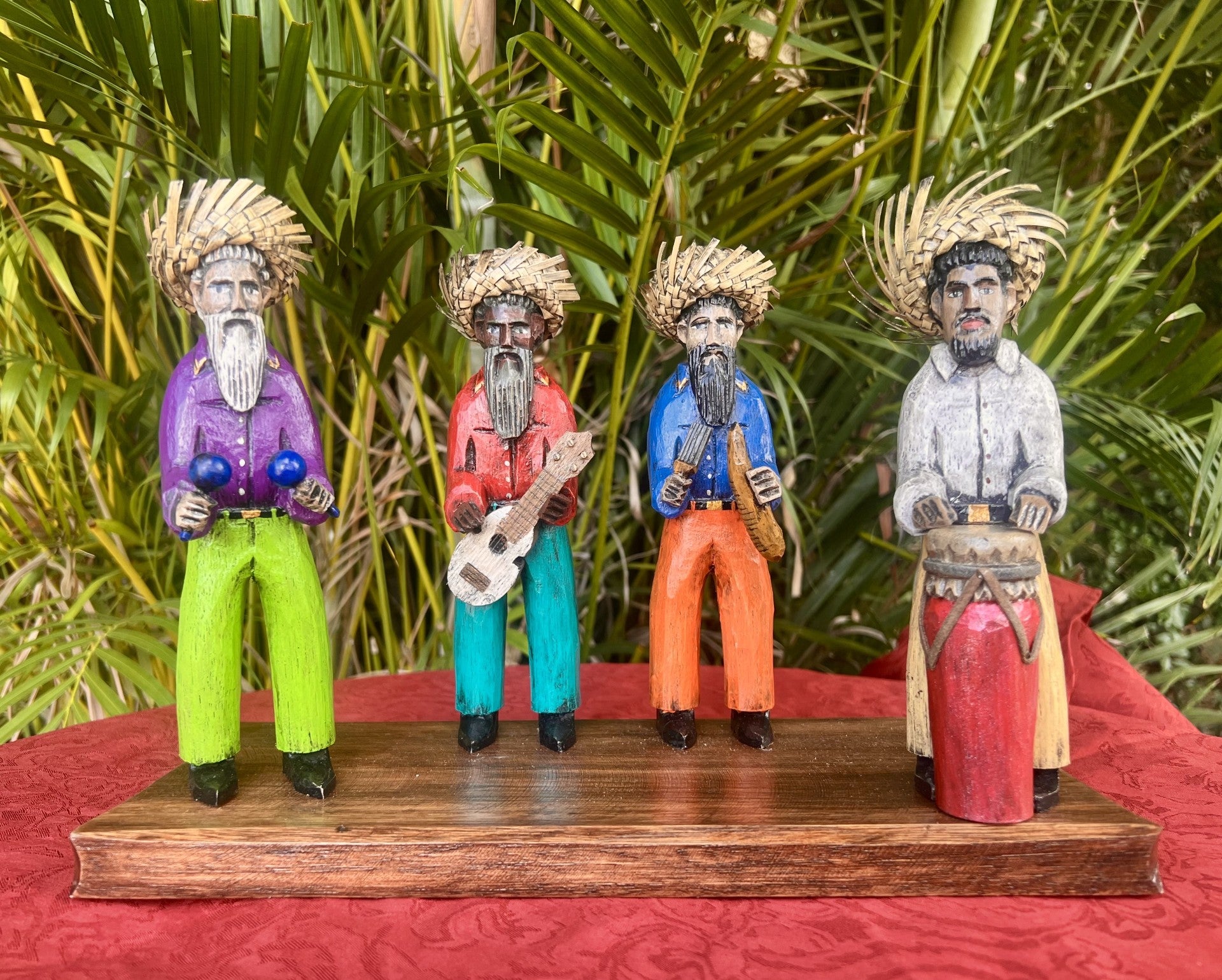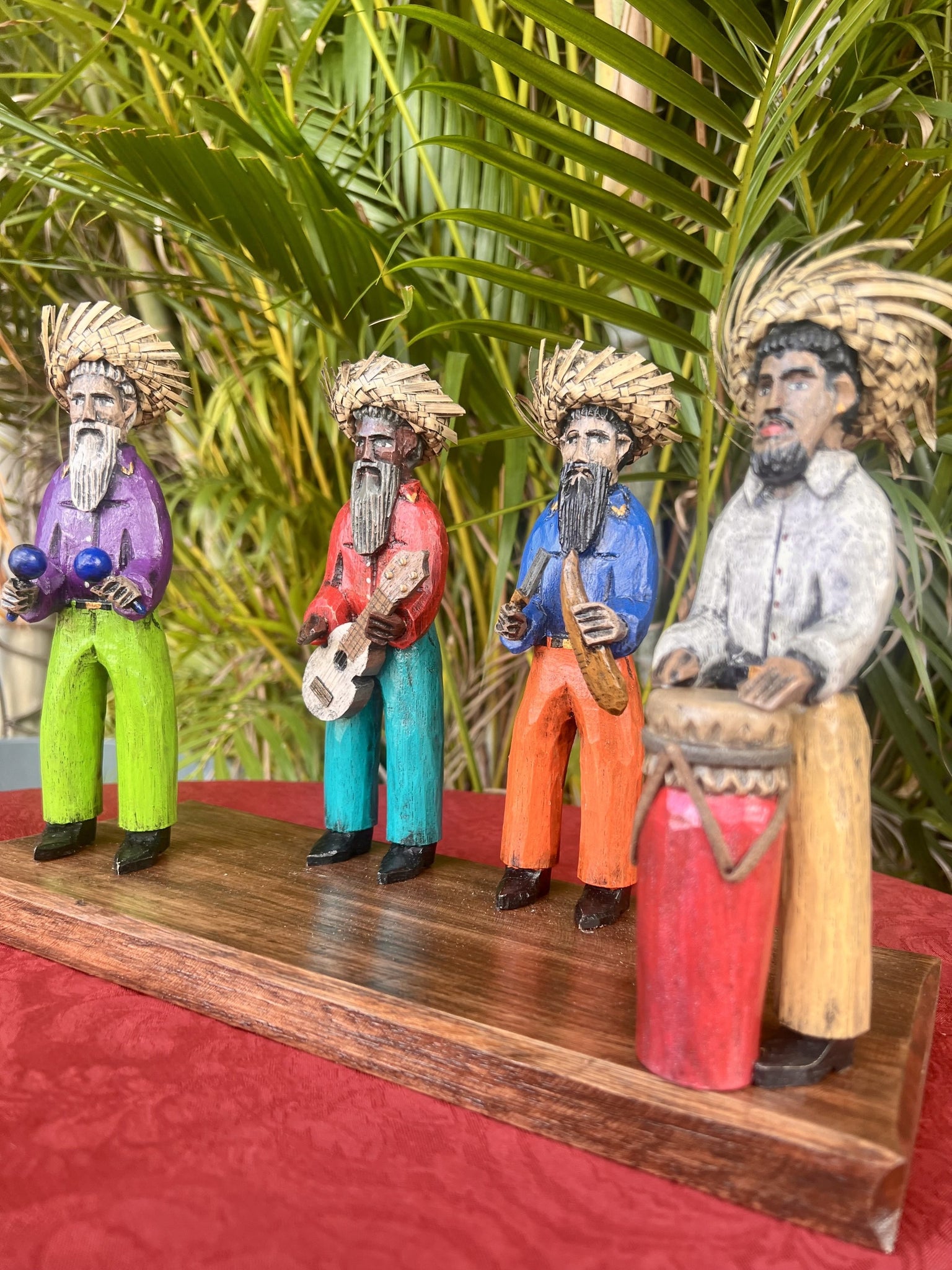 Aqui Don Adrian nos presenta a los Tres Reyes Magos tocando las congas con el artista del momento el gran Benito (Bad Bunny). Otra pieza diferente de este gran artesano que no deja de sorprendernos con sus ocurrencias. Esta talla tiene una base de 12"x5" y una altura maxima de 8".